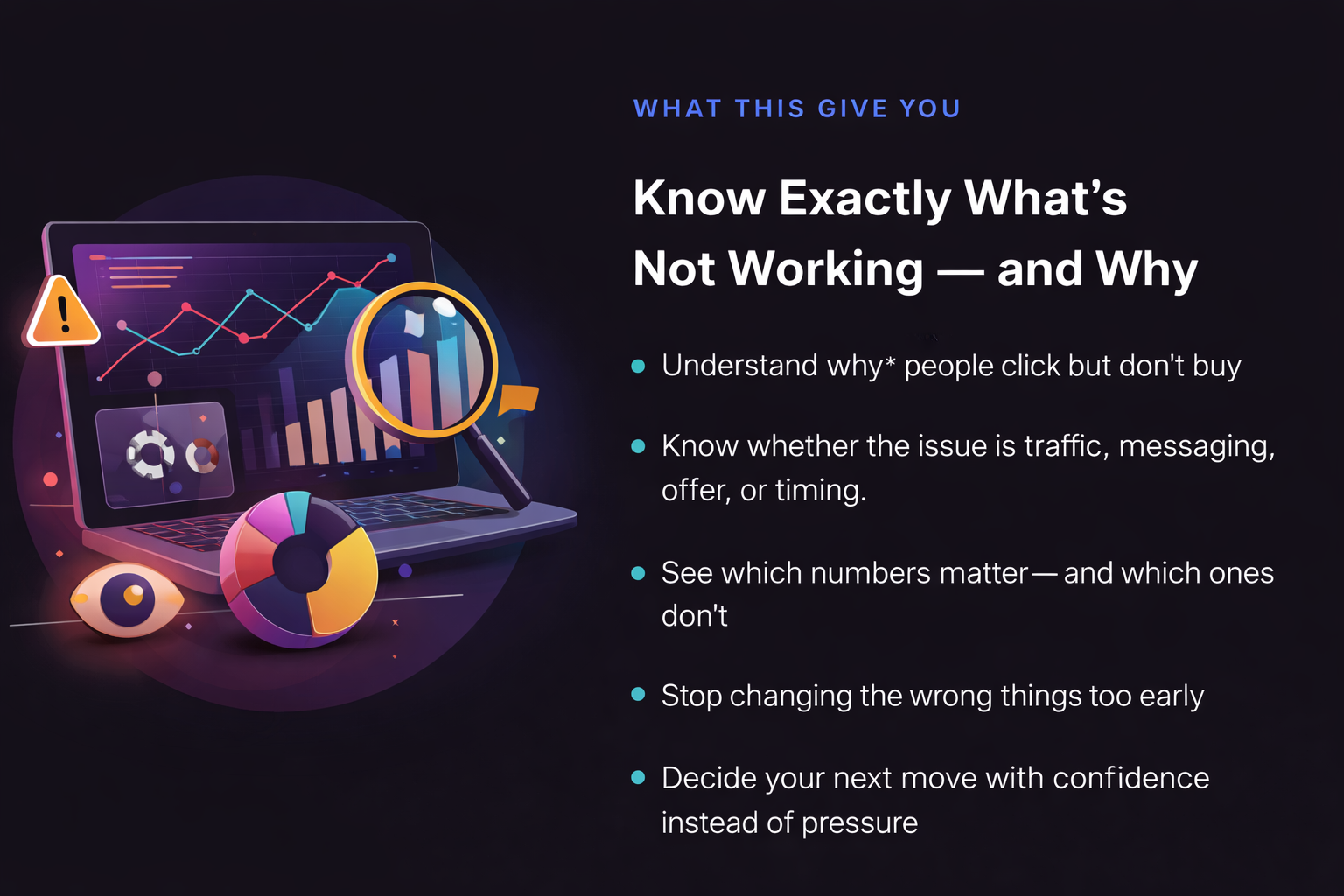 After You Launch is a step-by-step digital blueprint that shows you how to diagnose why your product, ads, or content aren’t converting — and how to decide whether to fix it, pause it, or scale it — without buying more courses, buying more coaching sessions or guessing.